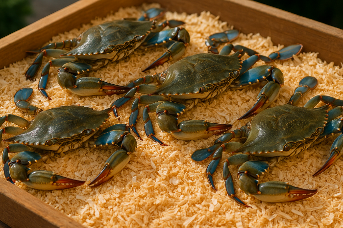 미세 입자의 톱밥이 체표를 부드럽게 감싸 표면 수분 손실을 줄입니다. 건조 스트레스가 완화되면 꽃게의 생존 시간이 늘고, 구매 시점까지 신선도가 유지됩니다.