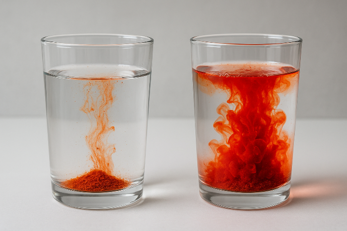 고춧가루의 붉은색은 주로 캡산틴, 캡소루빈 같은 천연 색소 성분에서 나옵니다. 이들은 물에 잘 녹지 않기 때문에 서서히 확산됩니다. 반면, 가짜 고춧가루에 쓰이는 인공 염료는 물에 잘 녹도록 제조되어 있어 즉시 붉게 퍼지는 것입니다.