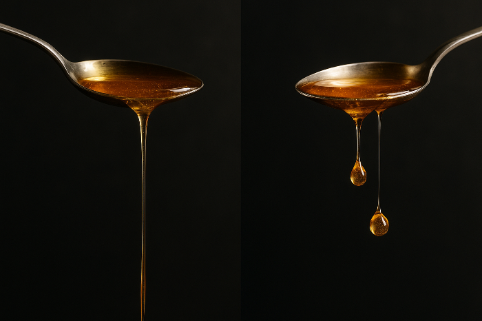 꿀은 벌이 꽃에서 채취한 꿀즙을 숙성시켜 만든 천연 식품입니다. 이 과정에서 과당, 포도당, 효소, 미네랄, 아미노산 등이 복합적으로 작용해 진한 점성이 생깁니다. 반면, 가짜 꿀은 단순히 당 용액이기 때문에 점성이 낮고 물처럼 쉽게 흐릅니다. 따라서 꿀이 떨어지는 모습에서 차이가 나타나는 것입니다.