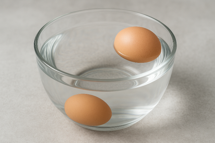 계란의 신선도를 확인하는 가장 간단한 방법 중 하나는 물에 넣어보는 것입니다. 그 원리는 계란 속의 공기 주머니(기실, 氣室)와 관련이 있습니다. 신선한 계란은 기실이 작아 무겁고, 오래될수록 기실이 커져 가벼워집니다. 이 차이가 물에서의 부력에 영향을 주어 다음과 같은 결과를 만들어냅니다.