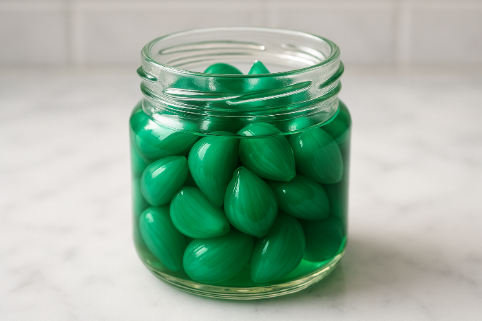 식초·설탕·간장에 절인 흰 마늘이 며칠 사이 녹색 마늘장아찌로 변한다. 색은 충격적이지만, 이는 냉장·가열이 아닌 산성( pH < 4 ) 환경에서 일어나는 자연 반응이다.