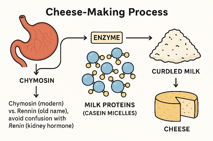 “우유 응유를 위해 사용하는 렌넷(Rennet)은 주로 송아지 위에서 유래한 키모신(Chymosin)을 주성분으로 하며, 이는 κ-카제인을 절단하여 응고를 유도한다. 과거에는 키모신을 레닌(Rennin)이라 지칭했으나, 이는 신장 효소인 레닌(Renin)과 혼동될 수 있어 현재는 사용을 지양한다.”