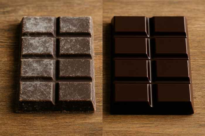 - 온도 변화: 초콜릿이 높은 온도에서 녹거나 다시 식는 과정에서 지방이 재결정화되어 표면에 하얀 막처럼 나타납니다.