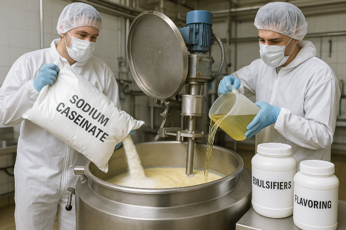정의: 자연치즈에 카제인나트륨, 식물성 유지, 유화제 등을 혼합·가열해 만든 치즈 유사 제품 원료: 카제인나트륨 + 식물성 유지(팜유, 야자유 등) + 유화제 + 향료·색소 특징: